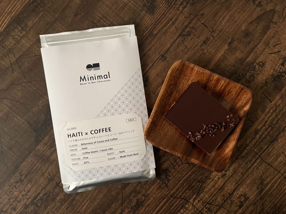 コーヒー豆とカカオ豆を一緒に挽いたミルクチョコにカカオニブをトッピング。
