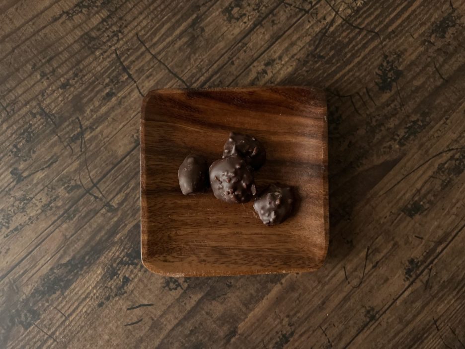 キャラメリゼされたナッツがダークチョコとともにコーティングされている。