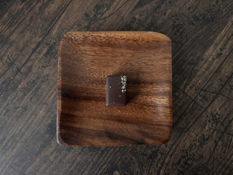 余韻にコーティングのカカオの香りとアーモンドペーストの爽やかな甘い香り。